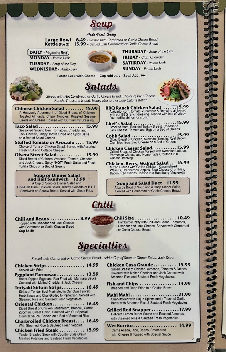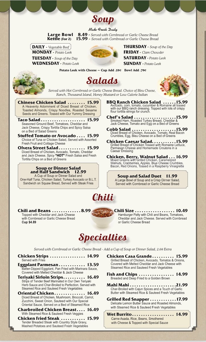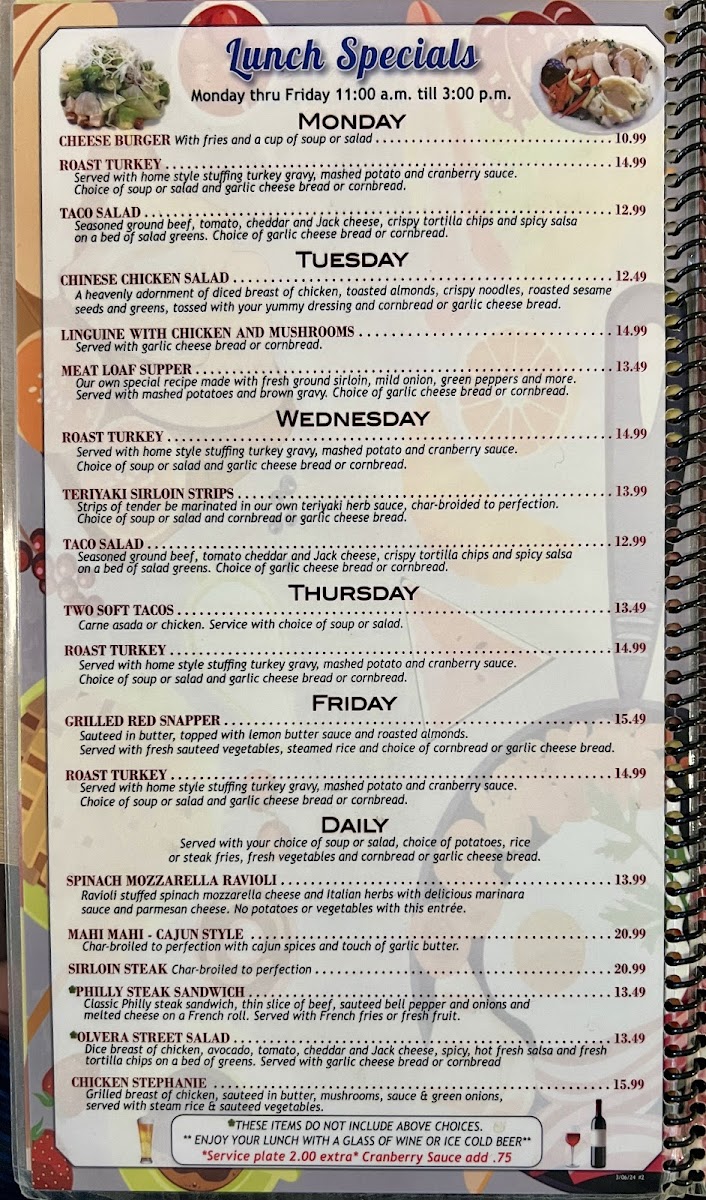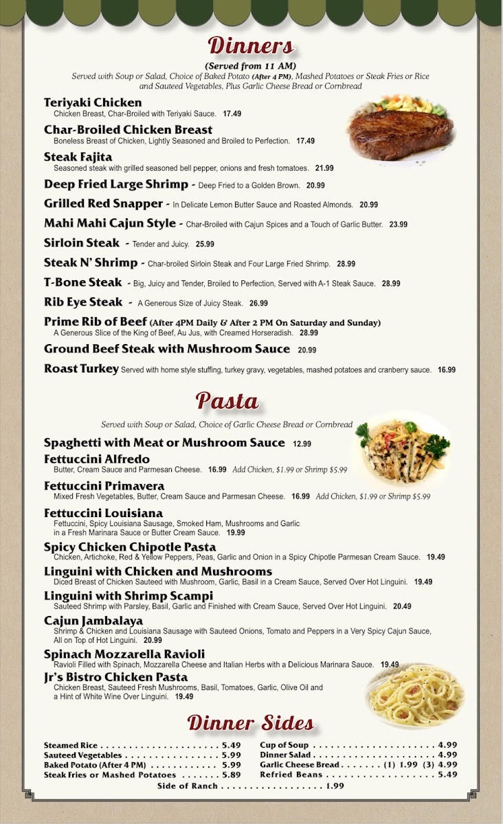 A generous slice of the king of beef, au jus, with creamed horseradish. Served with soup or salad, and garlic bread or cornbread. Dinner Specials: 24.99